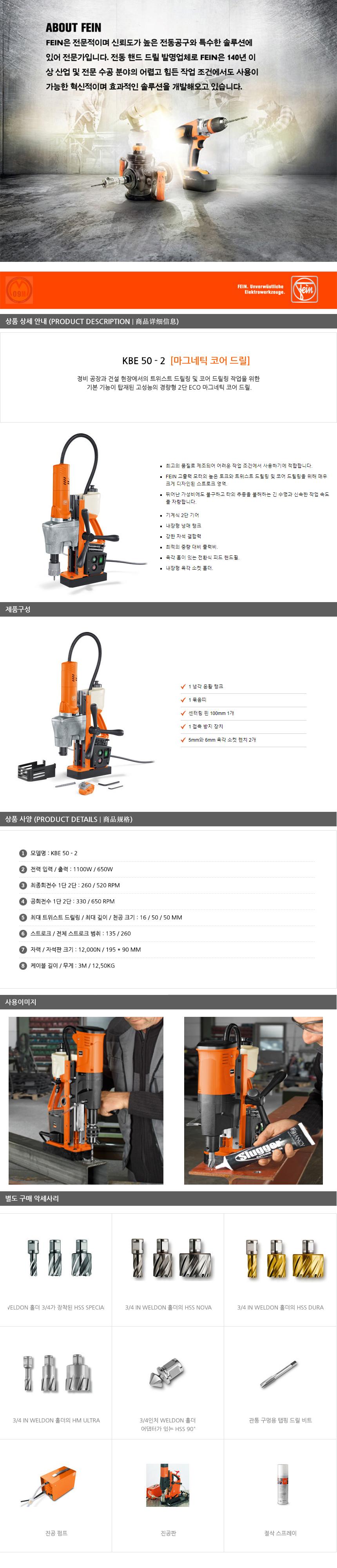파인 마그네틱코어드릴 KBE50-2M , 마그드릴, FEIN, 코아드릴 , 천공작업