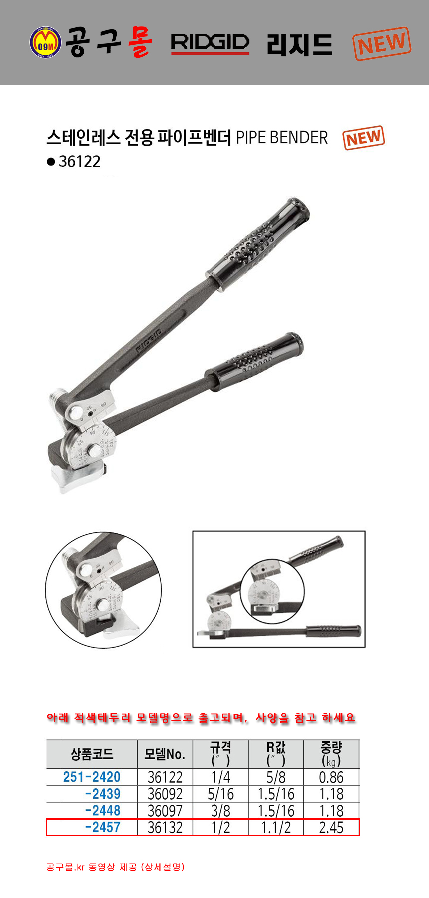 파이프벤더(스테인레스) 1/2 (36132) RIDGID, 리지드,공구몰,스텐파이프밴더,스탠파이프밴더,251-2457