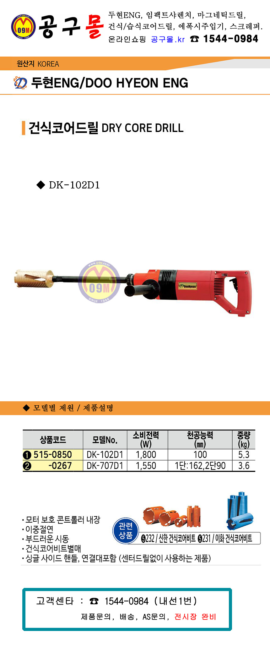 두현ENG 건식코어드릴 DK-102D1 공구몰, 코어드릴, 건식코아드릴, 515-0850