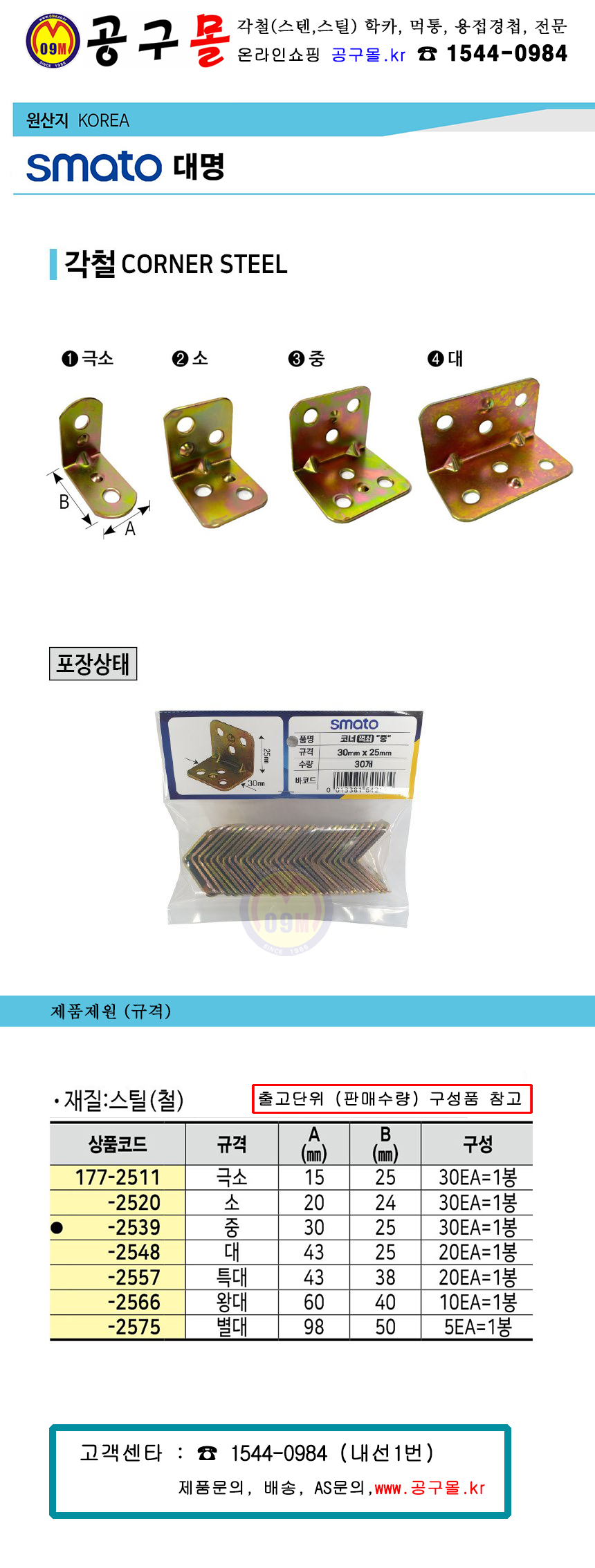 스마토대명 각철(봉지) 중(30*25) 세트포장(30EA) SMATO 대명, 철코너, 스틸코너, 공구몰, 울산철물점, 177-2539