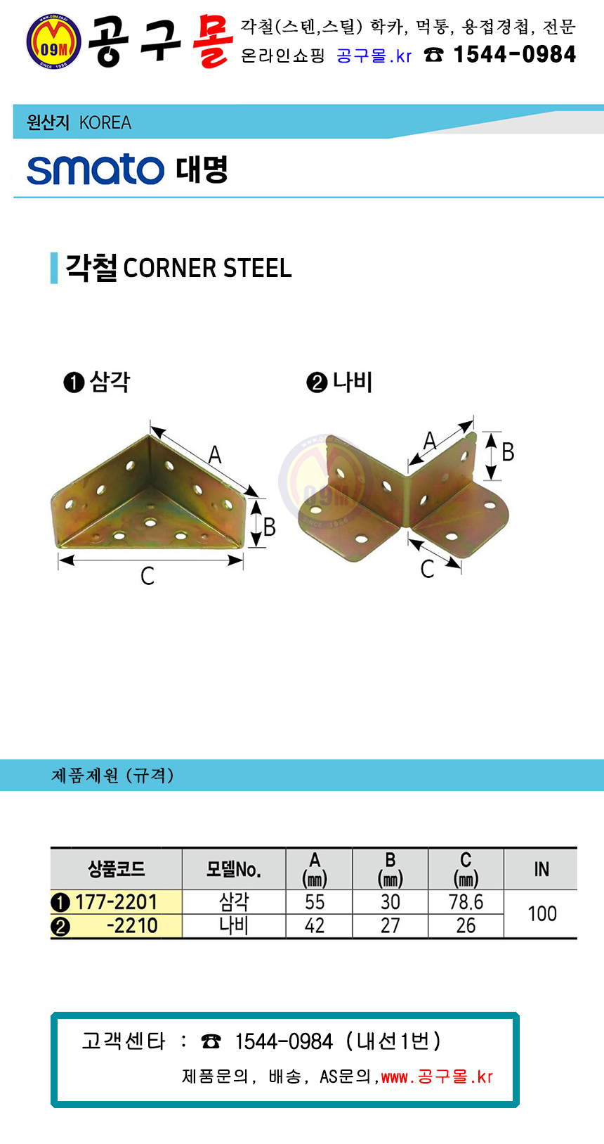 스마토대명 각철 (나비) 100개 SMATO 대명, 스틸코너, 나비코너, 공구몰, 울산철물점,177-2210