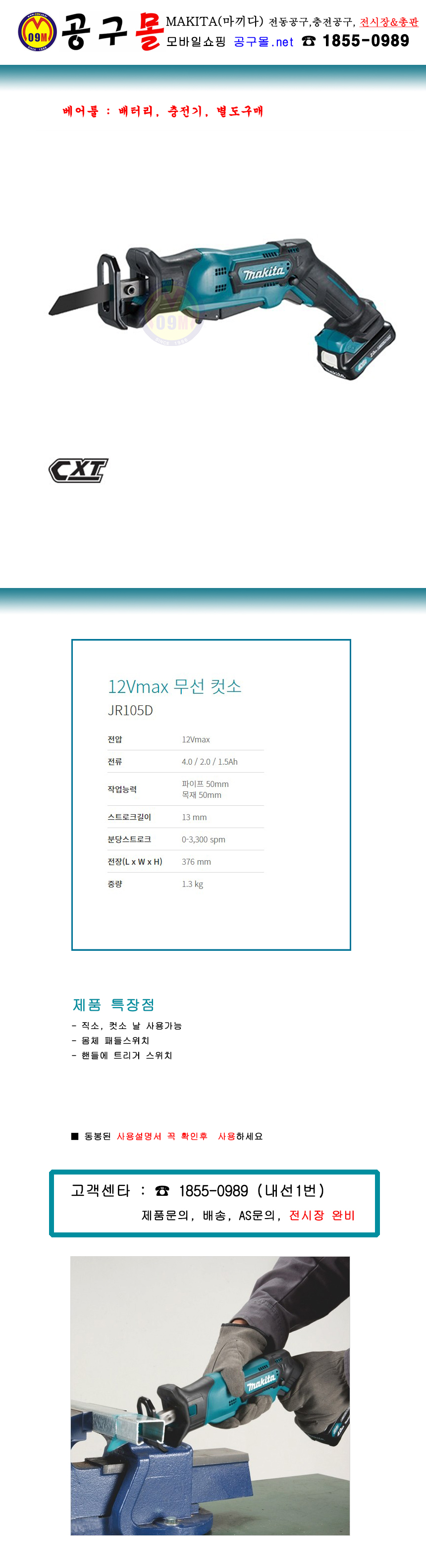 마끼다 12V 충전컷소(베어툴) JR105DZ (배터리, 충전기 별매) MAKITA, 공구몰, 충전컷쏘, 충전컷소, 무선톱, 충전컷소