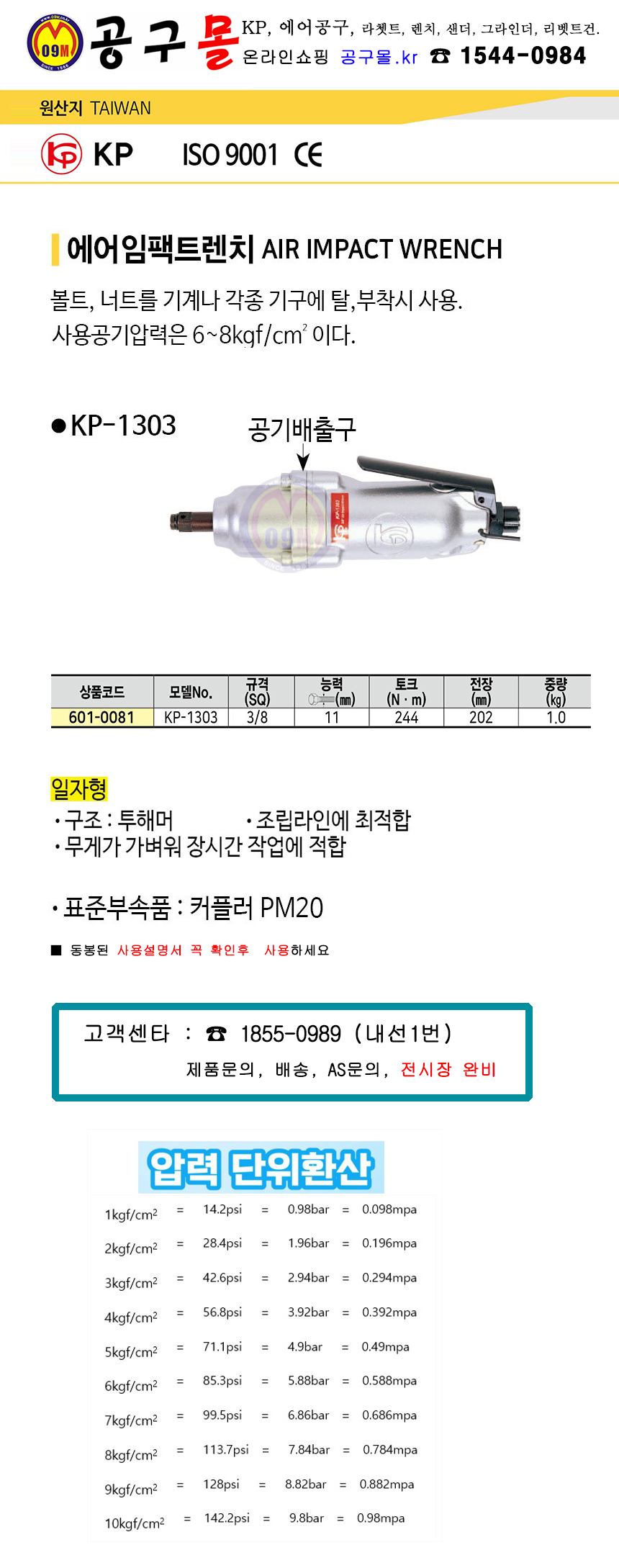KP 에어임팩트렌치 KP-1011J (3/8SQ) 권총형 에어공구, 임팩트렌치, 에어렌치, 공구몰