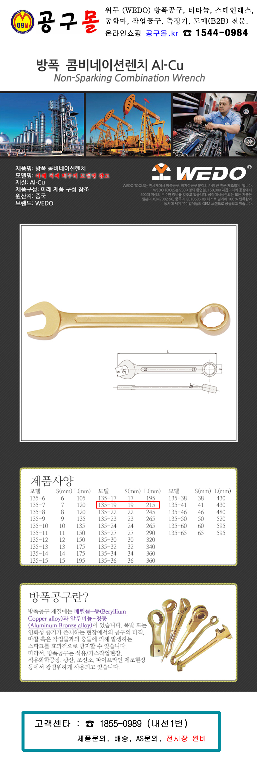 위두 방폭콤비네이션렌치(AL-CU) 19mm NS135-19 WEDO, 공구몰, 방폭수공구, 작업공구, 800564143560