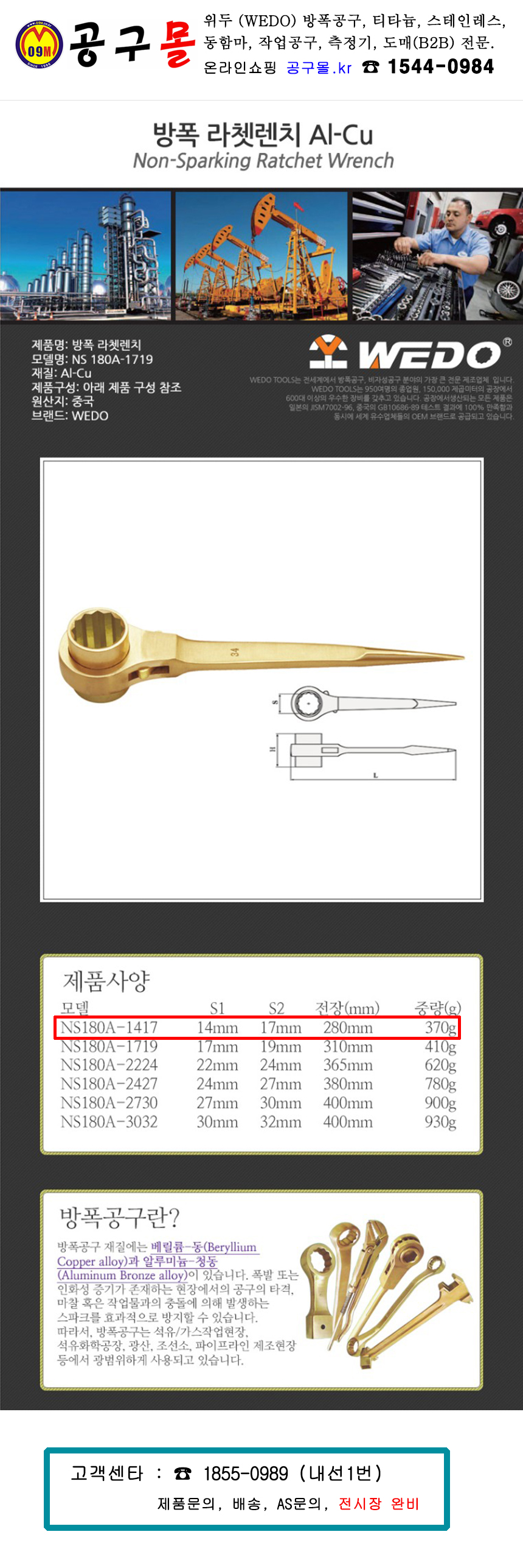 위두 방폭라쳇렌치 14x17mm (NS180A-1417/AL-CU) WEDO, 공구몰, 방폭수공구, 작업공구, 800564254235
