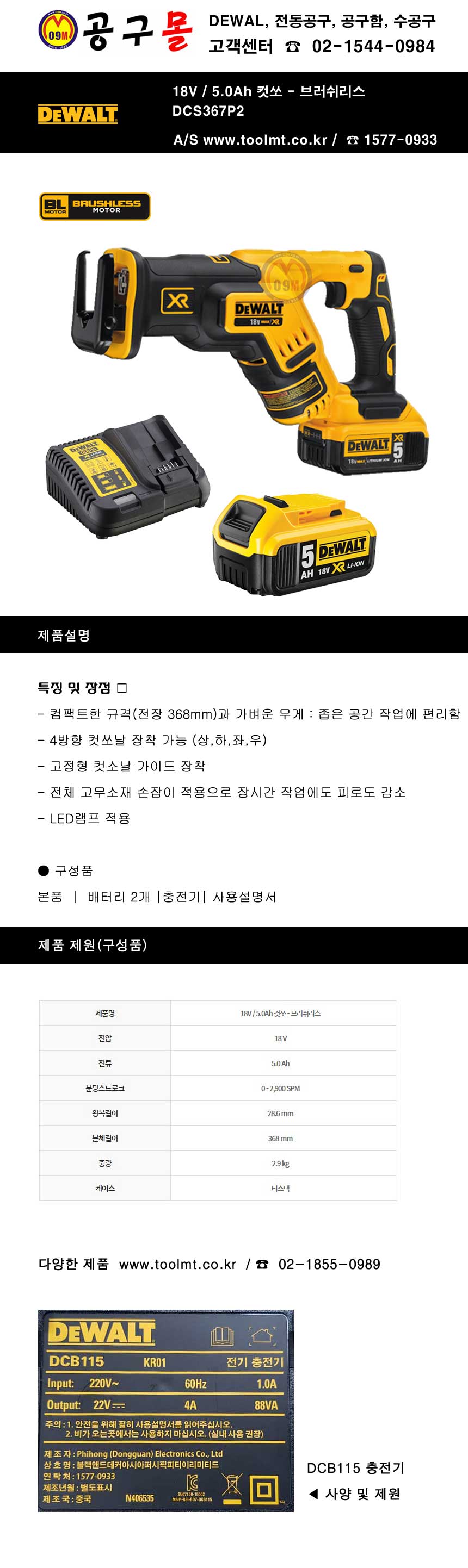 디월트 18V BL 충전컷쏘 DCS367P2 (5Ah 2개) 디월트,DEWALT, 충전톱, 컷소,왕복톱, 전기톱,,C510-3162