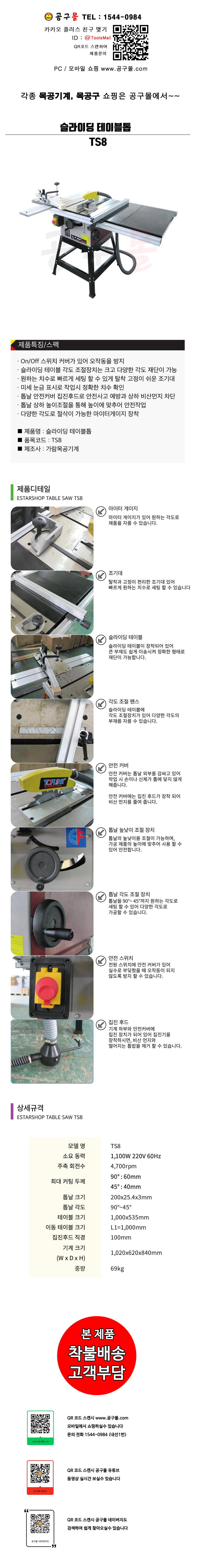 KR산업 슬라이딩 테이블쏘(8) TS8 69Kg,1,100W(1.5HP) 테이블톱, 목공기계