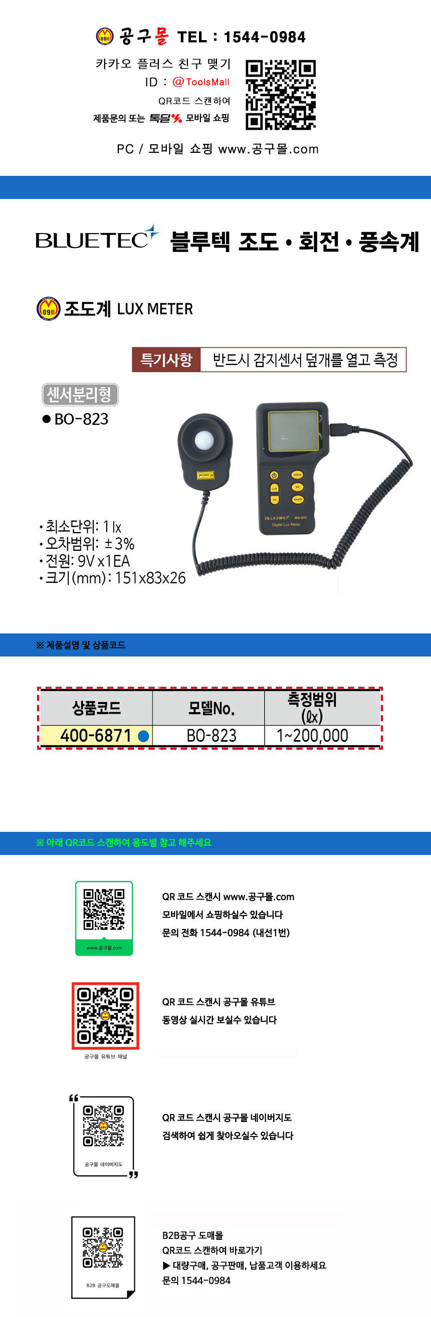 블루텍 조도계(조명측정) BO-823 (센서분리형) 디지털 조도테스터, BLUETEC, 공구몰, 400-6871