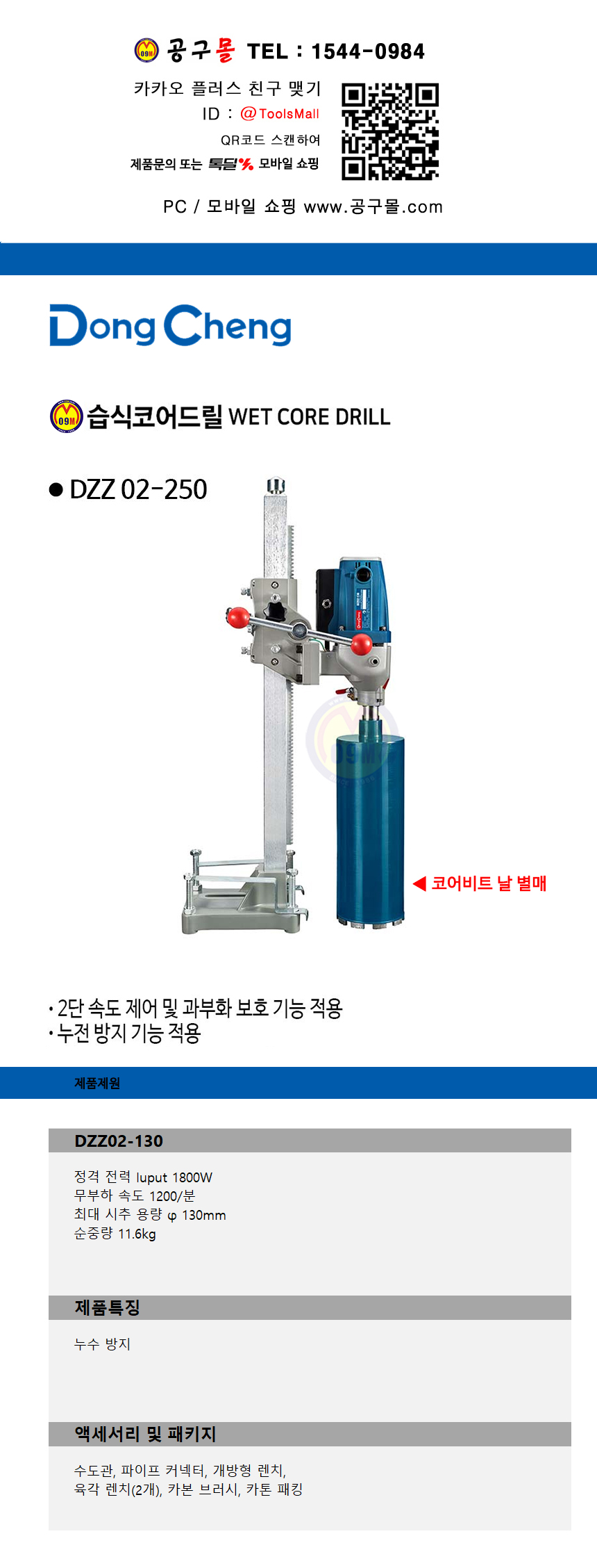 동청 습식코어드릴 DZZ02-130 130mm, 1800W, 날별매, DongCheng 공구몰닷컴 585-6079