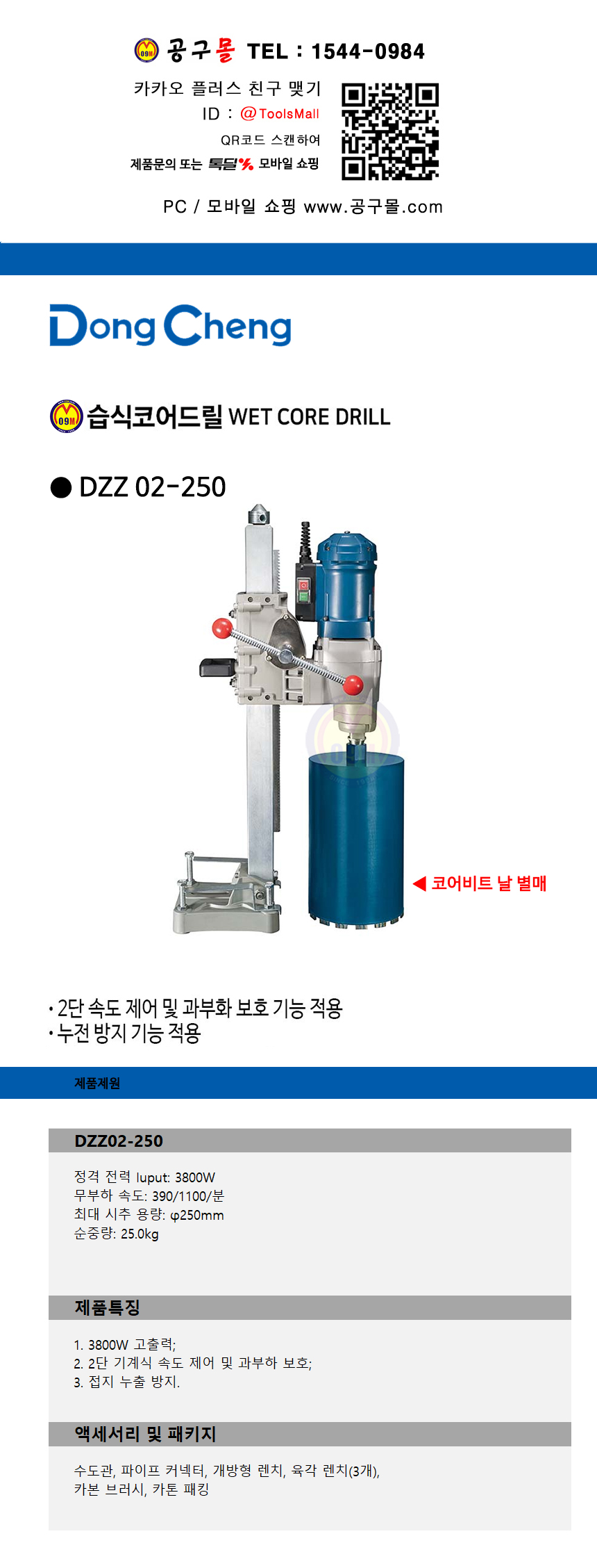 동청 습식코어드릴 DZZ02-250 250mm, 3800W, 날별매, 속도조절, DongCheng 공구몰닷컴 585-0622