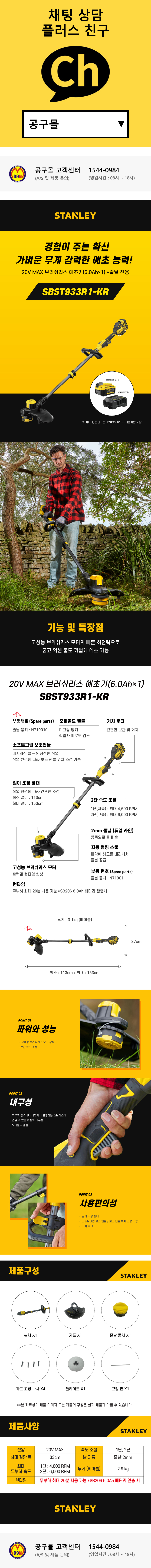 스탠리 20V MAX 충전예초기 SBST933R1 (20V-6AH 1개세트) 나일론줄전용 마당용 잔디용