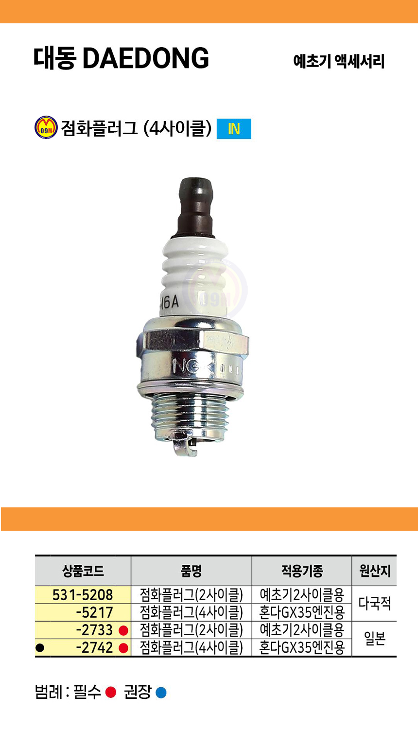 대동 점화플러그 예초기 4사이클용(일산) 예초기플러거 예초기부품, 공구몰 531-2742