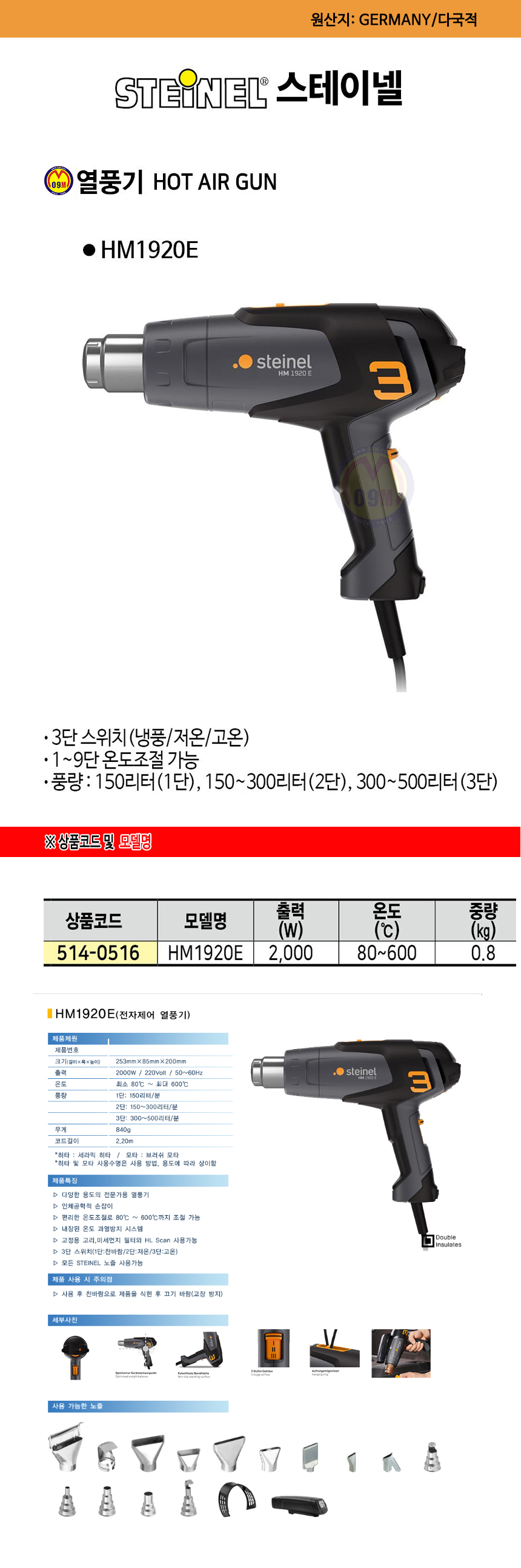 스테이넬 열풍기 HM-1920E 2000W 80-630도 풍량, 온도조절 STEINEL 514-0516