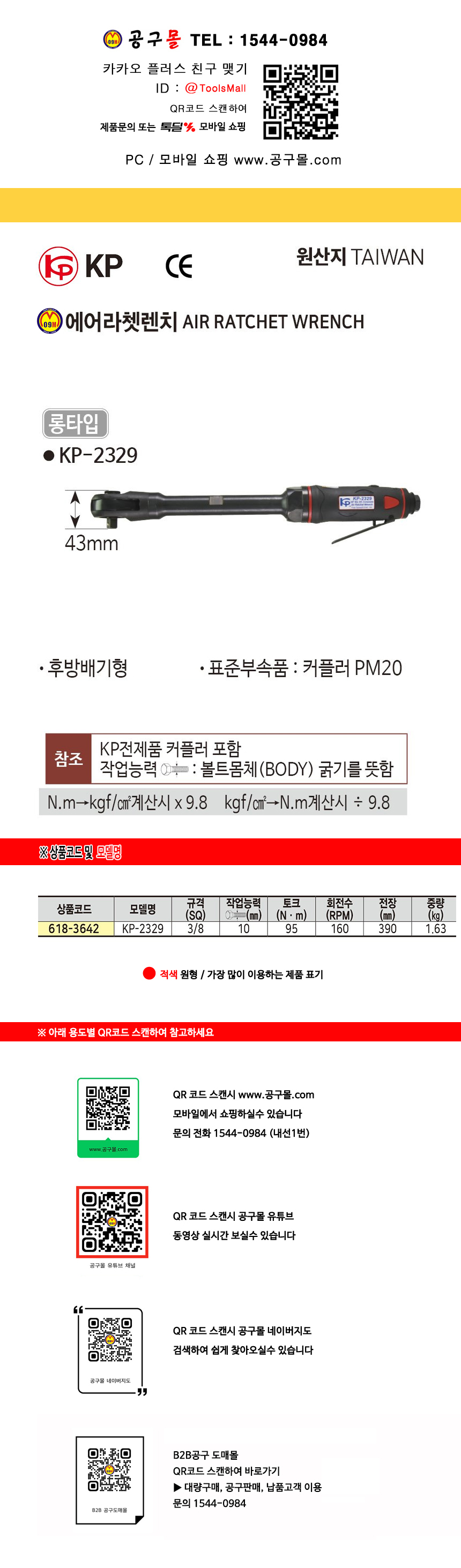 KP 에어라쳇트렌치 KP-2329 (3/8SQ)롱타입 에어공구, 에어라체트 공구몰 618-3642