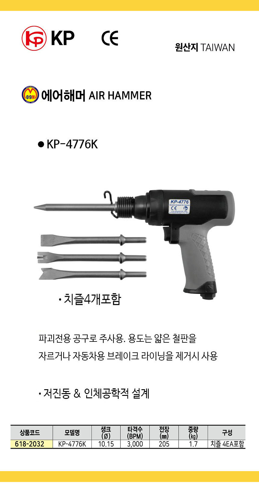 KP 에어해머세트 KP-4776K (4p) 샹크10.15mm 205mm 1.7Kg 에어공구, 에어해머, 다가네 공구몰 618-2032