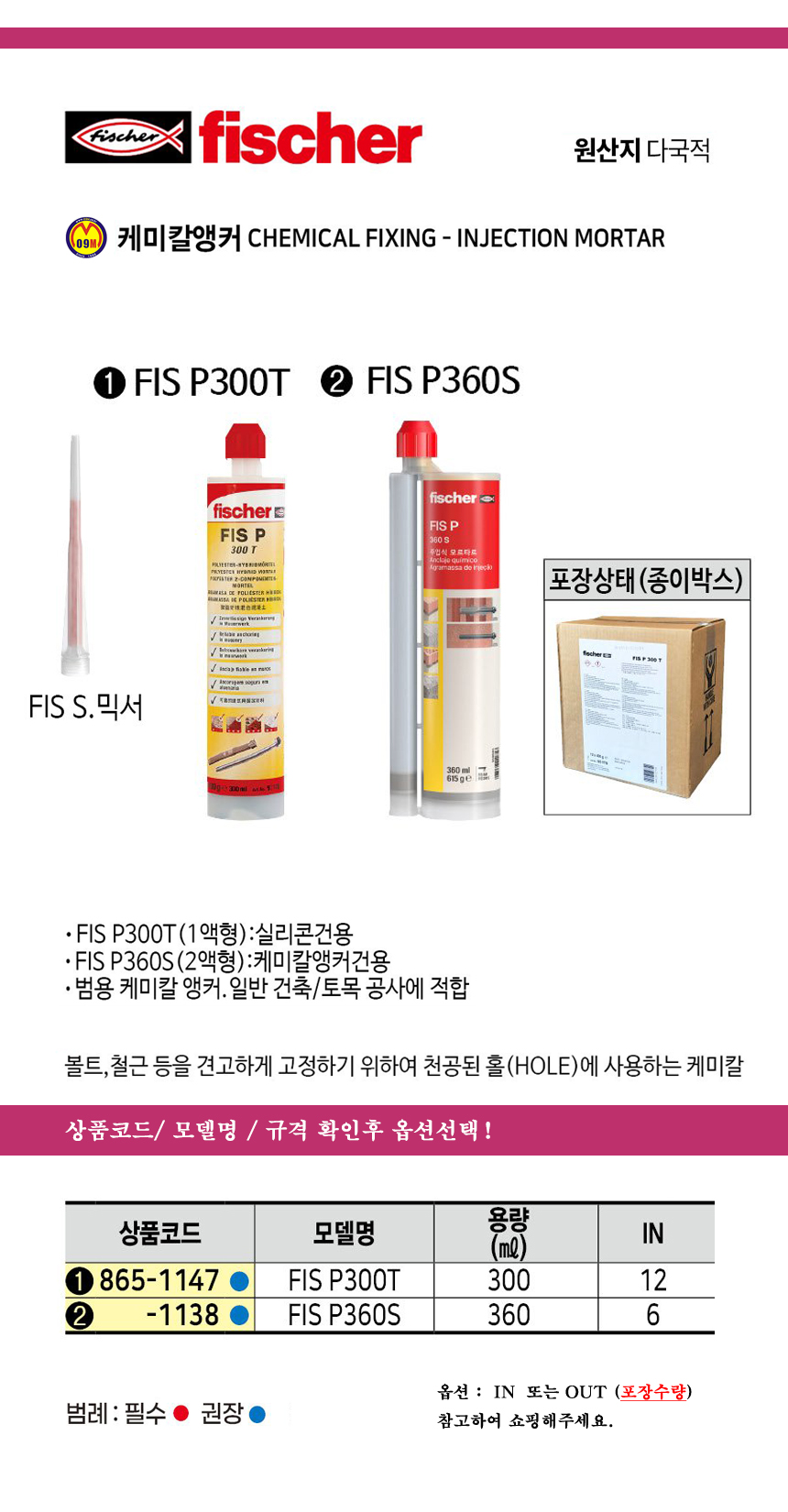 피셔 케미칼앵커 FIS P360S-2액형/ NO.558803(360ML) fischer, 공구몰 865-1138