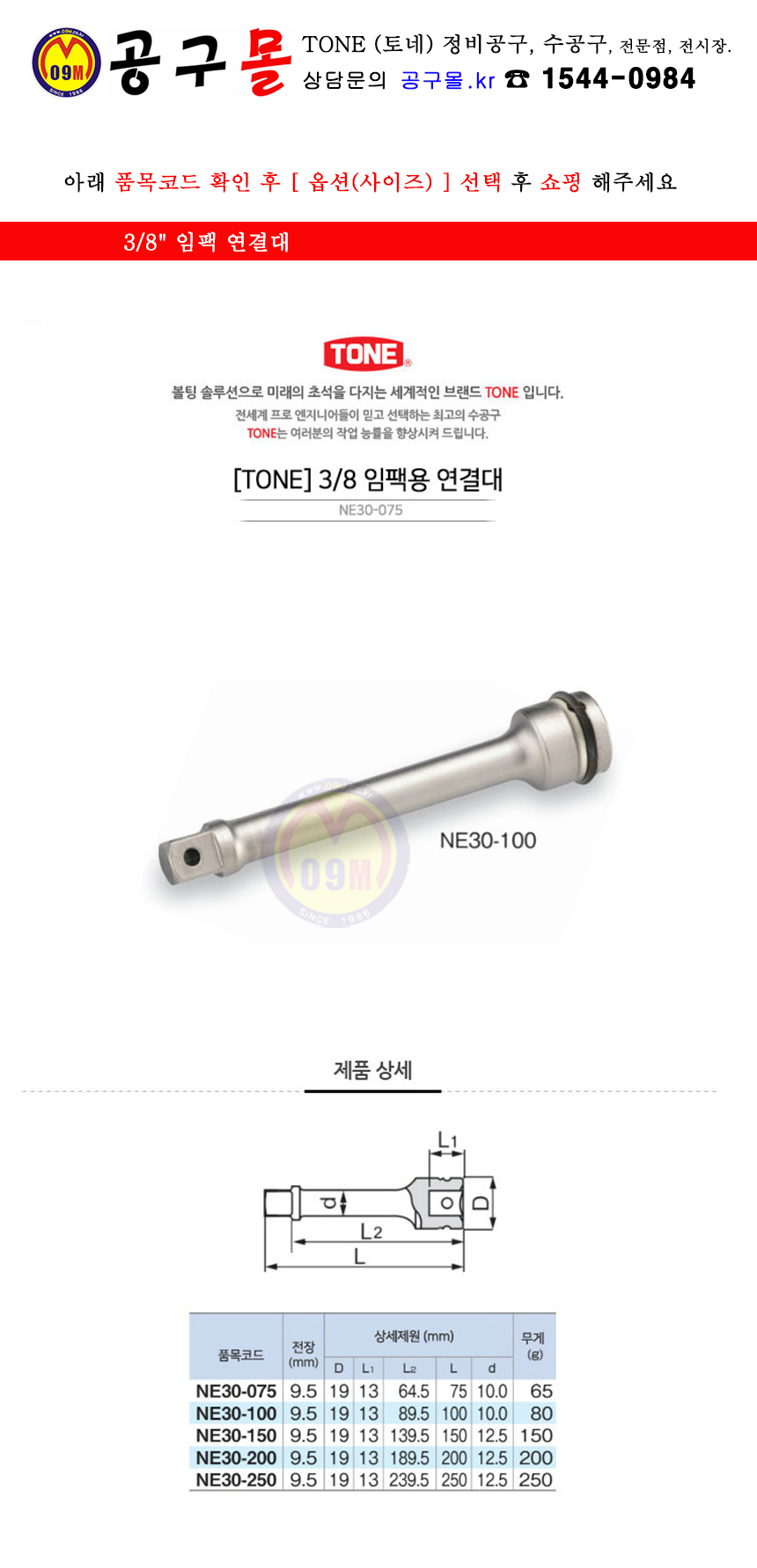 TONE(토네) 1/2 임팩 연결대 NE40-075,NE40-100,NE40-125,NE40-150, 공구몰닷컴