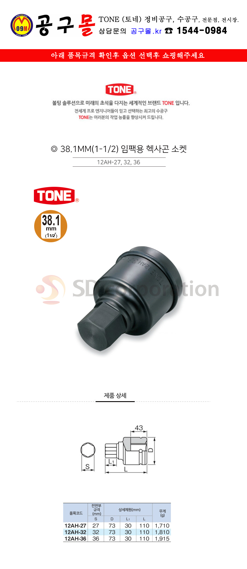 TONE(토네) 1-1/2 임팩 육각비트소켓 12AH-27/36 (27,32,36mm) 110mm 해드복스, 공구몰닷컴