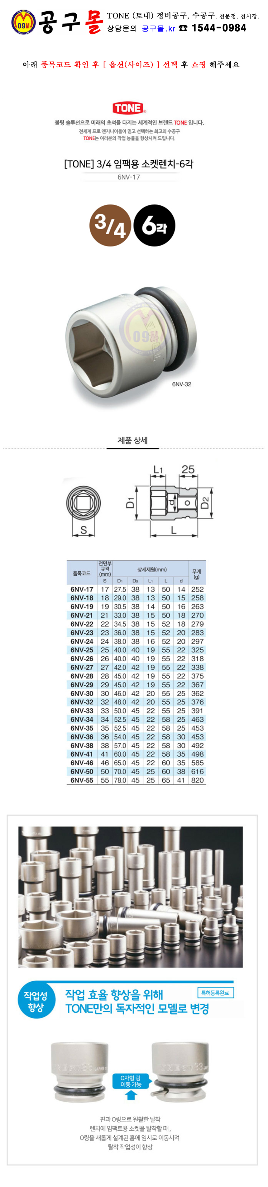 TONE 3/4-6각 임팩소켓(50-58mm) 6NV-17/36 (17-36mm) 토네, 임팩복스알,,6NV-17