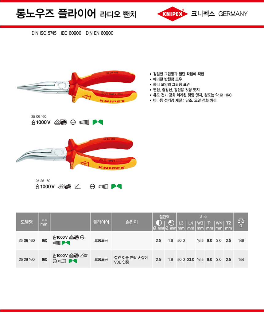 크니펙스 플라이어(롱노우즈,절연) 25-06-160, 25-06-160SB KNIPEX 독일공구, 수공구 작업공구, 공구몰 추천 101001020076