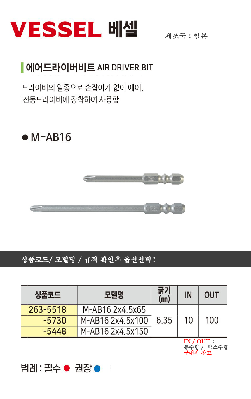 베셀 드라이버 비트 M-AB16 십자2x4.5x65mm/ 150mm VESSEL 263-5518