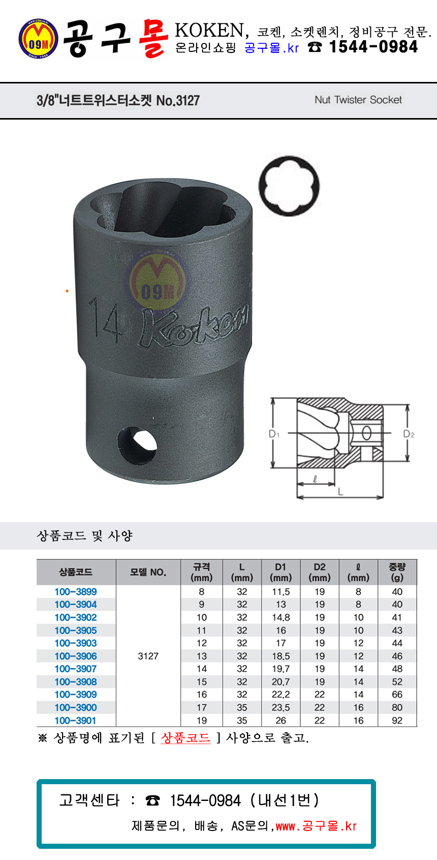 코켄 너트 트위스터소켓 3127 3/8(8mm, 19mm) KOKEN, 복스알,100-3899